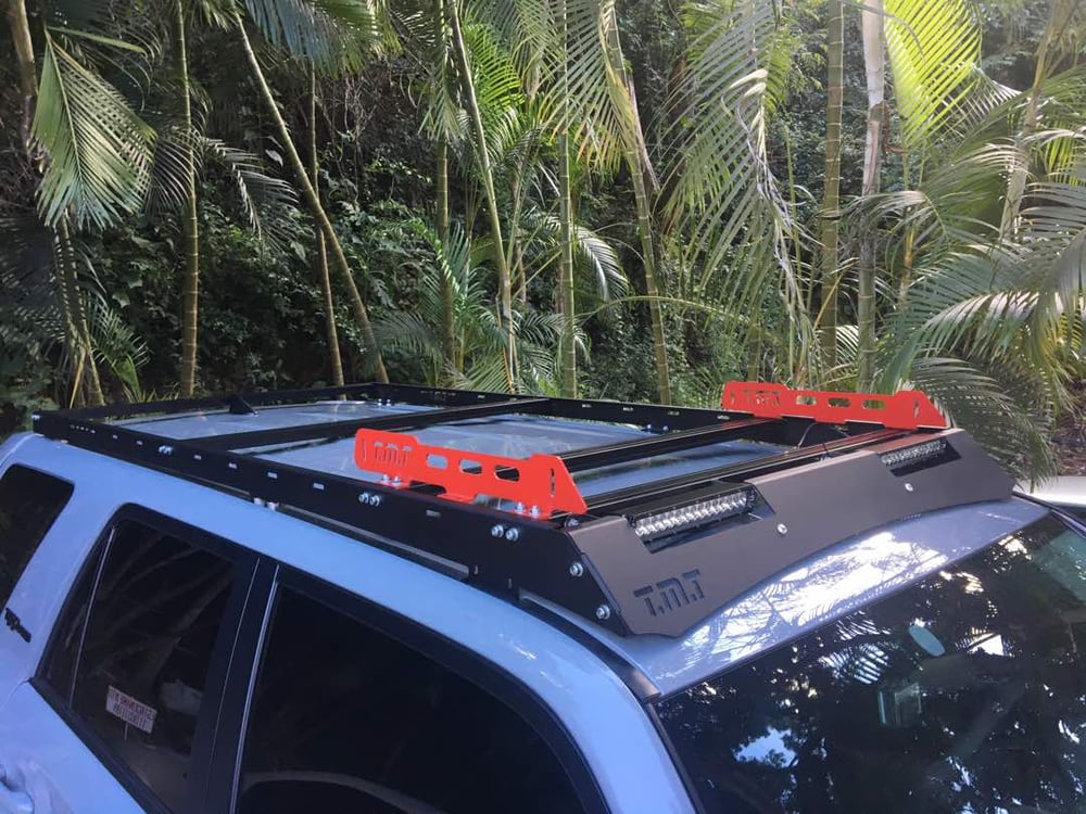 The 4x4 TMT Skyline Roof Rack is the perfect complement for Toyota 4Runner 5th Generation (2010-Present) in off-road trips. The roof rack kit contains a Wind Deflector, 2 Side-beams and 6 Crossbar, all of them made in strict compliance with the highest quality standards. You can select the roof rack either in raw metal or with powder coating micro-textured black. It can be installed more comfortably since drilling the roof is not necessary. You will only use the existing factory mounting points.